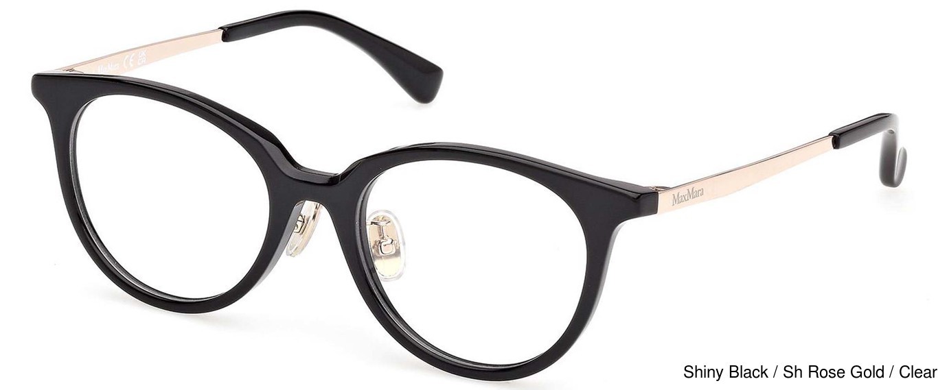 The Max Mara Eyeglasses MM5218-D 001 comes in 1 colors. The official color/codes are Shiny Black / Sh Rose Gold / Clear. There may be other colors available that were not initially released by the manufacturer.
