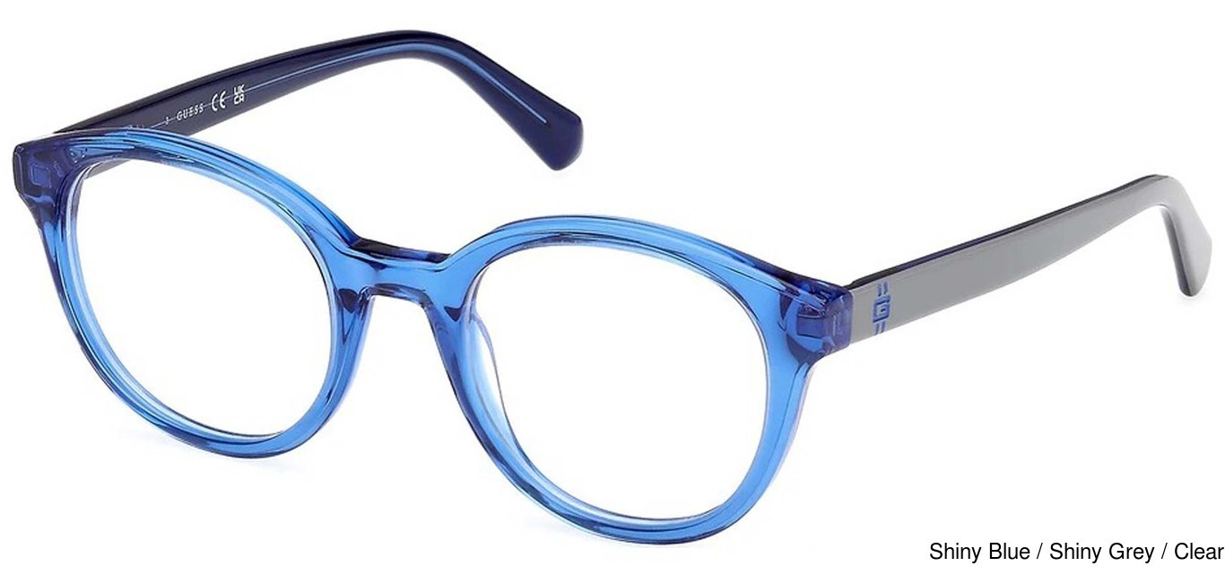 The Guess Eyeglasses GU50263 092 comes in 1 colors. The official color/codes are Shiny Blue / Shiny Grey / Clear. There may be other colors available that were not initially released by the manufacturer.