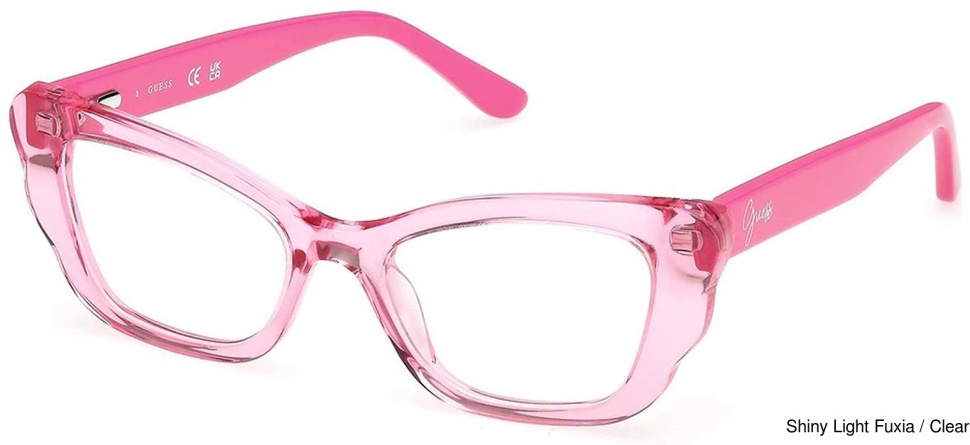 The Guess Eyeglasses GU50264 075 comes in 1 colors. The official color/codes are Shiny Light Fuxia / Clear. There may be other colors available that were not initially released by the manufacturer.