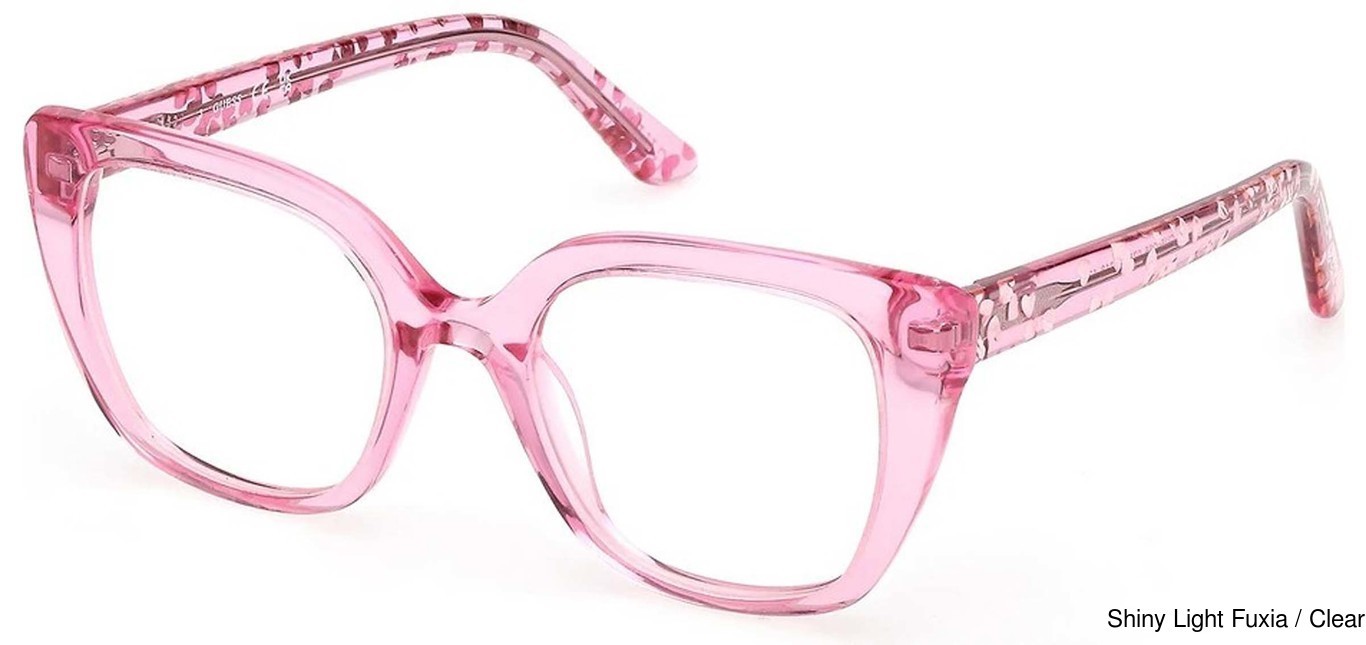 The Guess Eyeglasses GU50265 075 comes in 1 colors. The official color/codes are Shiny Light Fuxia / Clear. There may be other colors available that were not initially released by the manufacturer.