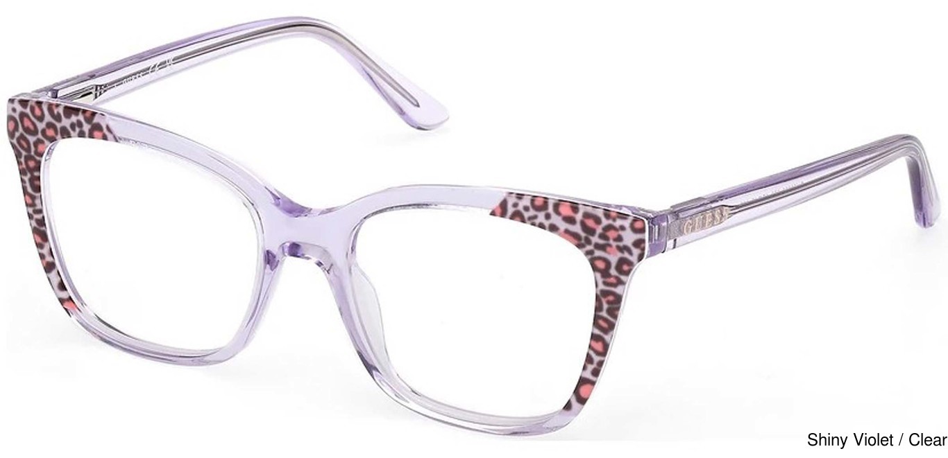 The Guess Eyeglasses GU50268 083 comes in 1 colors. The official color/codes are Shiny Violet / Clear. There may be other colors available that were not initially released by the manufacturer.