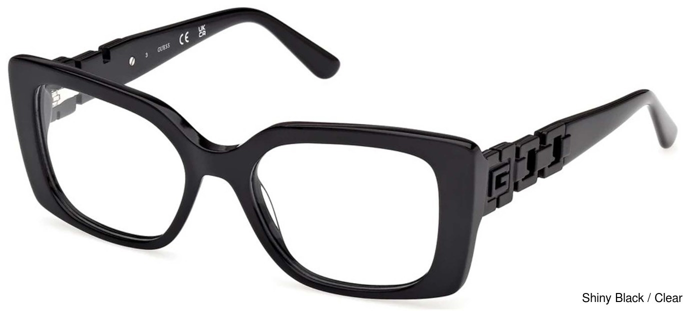 The Guess Eyeglasses GU50322 001 comes in 1 colors. The official color/codes are Shiny Black / Clear. There may be other colors available that were not initially released by the manufacturer.